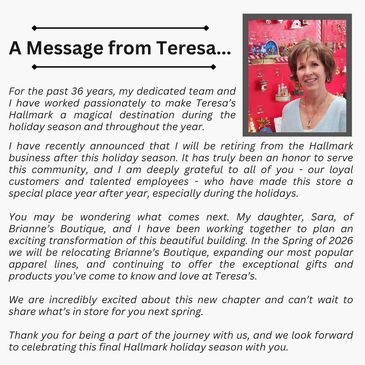 Teresa's Hallmark is a unique shopping destination worth the drive! Find inspiration while you browse thousands of gifts, jewelry, toys, holiday and home décor items. We are locally owned by Teresa Dillard and located in Greenwood, IN. We are one of the largest Hallmark stores in the United States and the only store with two levels and an elevator. Visit us during our last Holiday Season. We look for to seeing you.